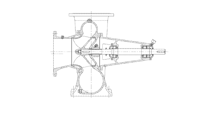 Naše poluaksijalne pumpe su jednostavnog dizajna, ali čvrstoća operativnih dijelova jamči visok stupanj sigurnosti, tipičnu za ovaj tip pumpi. Rotor, sa širokim prolaznim kanalima, nalegnuto je konzolno na vratilo, koje je uležišteno u kotrljajućim ležajevima, podmazivanim mašću. Kompletna pumpa stoji na dvije noge koje su u sastavu spiralnog kućišta. Isporučeni presjeci pokazuju glavne dimenzije pumpi za standardne pozicije potisne prirubnice (VG, HO, KOD). Pumpe s drugim položajem prirubnica proizvodimo prema posebnoj narudžbi. Osim toga, ove pumpe proizvodimo i sa vertikalnim položajem pogonskog vratila.